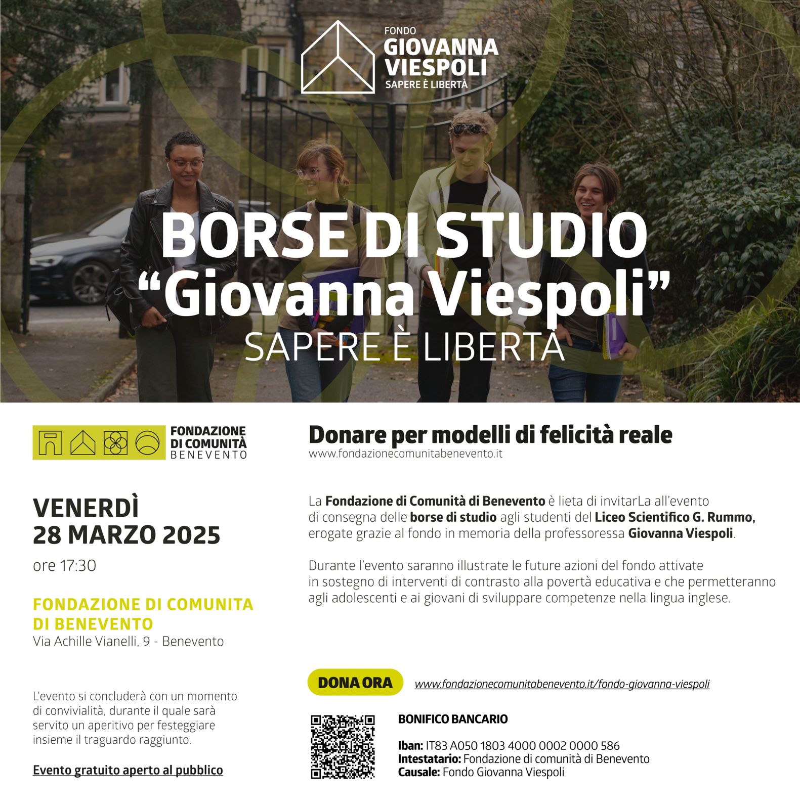 La Fondazione di Comunitร di Benevento รจ lieta di invitarvi allโevento di consegna delle borse di studio istituite grazie al ๐๐ผ๐ป๐ฑ๐ผ ๐บ๐ฒ๐บ๐ผ๐ฟ๐ถ๐ฎ๐น๐ฒ “๐๐ถ๐ผ๐๐ฎ๐ป๐ป๐ฎ ๐ฉ๐ถ๐ฒ๐๐ฝ๐ผ๐น๐ถ – ๐ฆ๐ฎ๐ฝ๐ฒ๐ฟ๐ฒ ๐ฒฬ ๐น๐ถ๐ฏ๐ฒ๐ฟ๐๐ฎฬ”, dedicate agli studenti del ๐๐ถ๐ฐ๐ฒ๐ผ ๐ฆ๐ฐ๐ถ๐ฒ๐ป๐๐ถ๐ณ๐ถ๐ฐ๐ผ ๐. ๐ฅ๐๐บ๐บ๐ผ.
